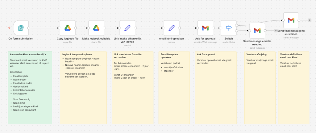 In de workflow ziet, zijn alle stappen naadloos met elkaar verbonden. Van het moment dat een klant het formulier invult tot het verzenden van de welkomstmail, verloopt alles automatisch zonder handmatige tussenkomst – behalve de optionele review-stap die kwaliteit waarborgt.